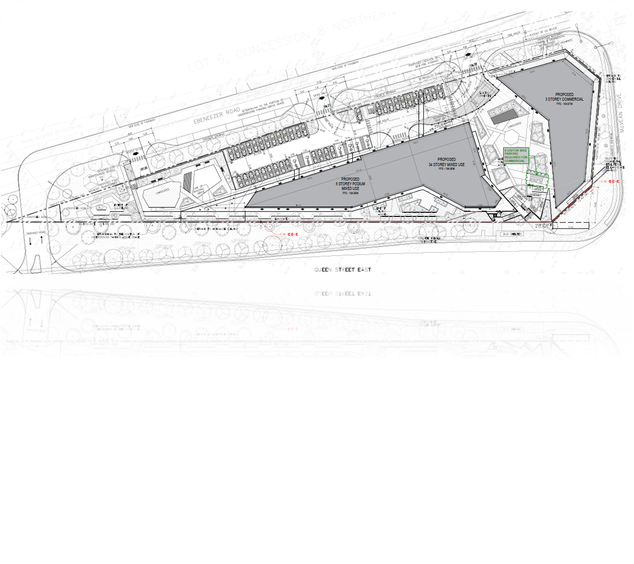 The purpose of the application is to amend the Official Plan, Secondary Plan and Zoning By-law to permit the development of two (2) buildings on the subject lands. The first building consists of a 3-storey office building with associated commercial uses. The second building consists of a 34-storey residential condominium tower with an 8-storey mixed-use podium and three levels of underground parking. The proposed development includes 4,180 square metres of office and commercial uses, 444 residential units, and 757 parking spaces, with vehicular access proposed from Ebenezer Road and a pedestrian corridor to allow access from Queen Street W.